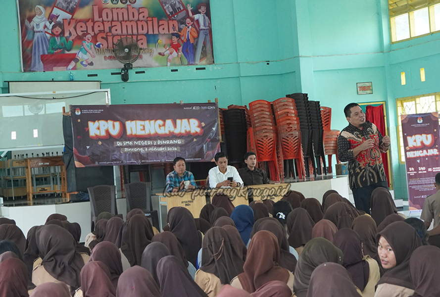 kab-pinrang.kpu.go.id - Komisi Pemilihan Umum (KPU) Kabupaten Pinrang sukses melaksanakan program "KPU Mengajar" yang dipusatkan di SMK Negeri 1 Pinrang sebagai sekolah perdana dari sepuluh sasaran SMA/SMK di seluruh Kabupaten Pinrang,  Rabu (7/1/26). Kegiatan ini merupakan kegiatan terintegrasi dari KPU Provinsi Sulawesi Selatan ke KPU Kabupaten/Kota se-Sulsel. Sebagai bentuk Sosialisasi dan Pendidikan Pemilih yang berkelanjutan serta terintegrasi di tingkat daerah. Melalui inisiatif ini, KPU berupaya mendekatkan diri dengan pemilih pemula guna memberikan pemahaman mendalam mengenai pentingnya partisipasi dalam pesta demokrasi. Dalam pelaksanaannya, Ketua beserta jajaran Anggota KPU Pinrang turun langsung ke Aula untuk membawakan materi dasar terkait kepemiluan. Para siswa(i) dibekali edukasi mengenai tahapan pemilu, pengenalan lembaga penyelenggara, hingga peran strategis pemuda dalam menjaga integritas proses demokrasi. SMK Negeri 1 Pinrang menjadi jadwal pembuka yang akan segera disusul oleh sembilan sekolah menengah lainnya, guna memastikan pesan literasi politik ini tersebar merata kepada Generasi Z di Bumi Lasinrang. Anggota KPU Pinrang Koordinator Divisi Sosialisasi, Pendidikan Pemilih, Partisipasi Masyarakat, dan SDM, Hamdan, menyatakan bahwa keterlibatan langsung komisioner di sekolah merupakan strategi efektif untuk membangun kesadaran politik yang sehat. "Kami ingin memastikan bahwa pemilih pemula tidak hanya sekadar datang ke TPS, tetapi memiliki basis pengetahuan yang kuat tentang nilai-nilai demokrasi. Program KPU Mengajar ini adalah bentuk komitmen kami dalam menghadirkan pendidikan pemilih yang terencana dan berkesinambungan," ungkapnya. Dengan program ini, KPU Pinrang optimis dapat meningkatkan kualitas partisipasi masyarakat secara signifikan pada pemilu mendatang. (Adl)