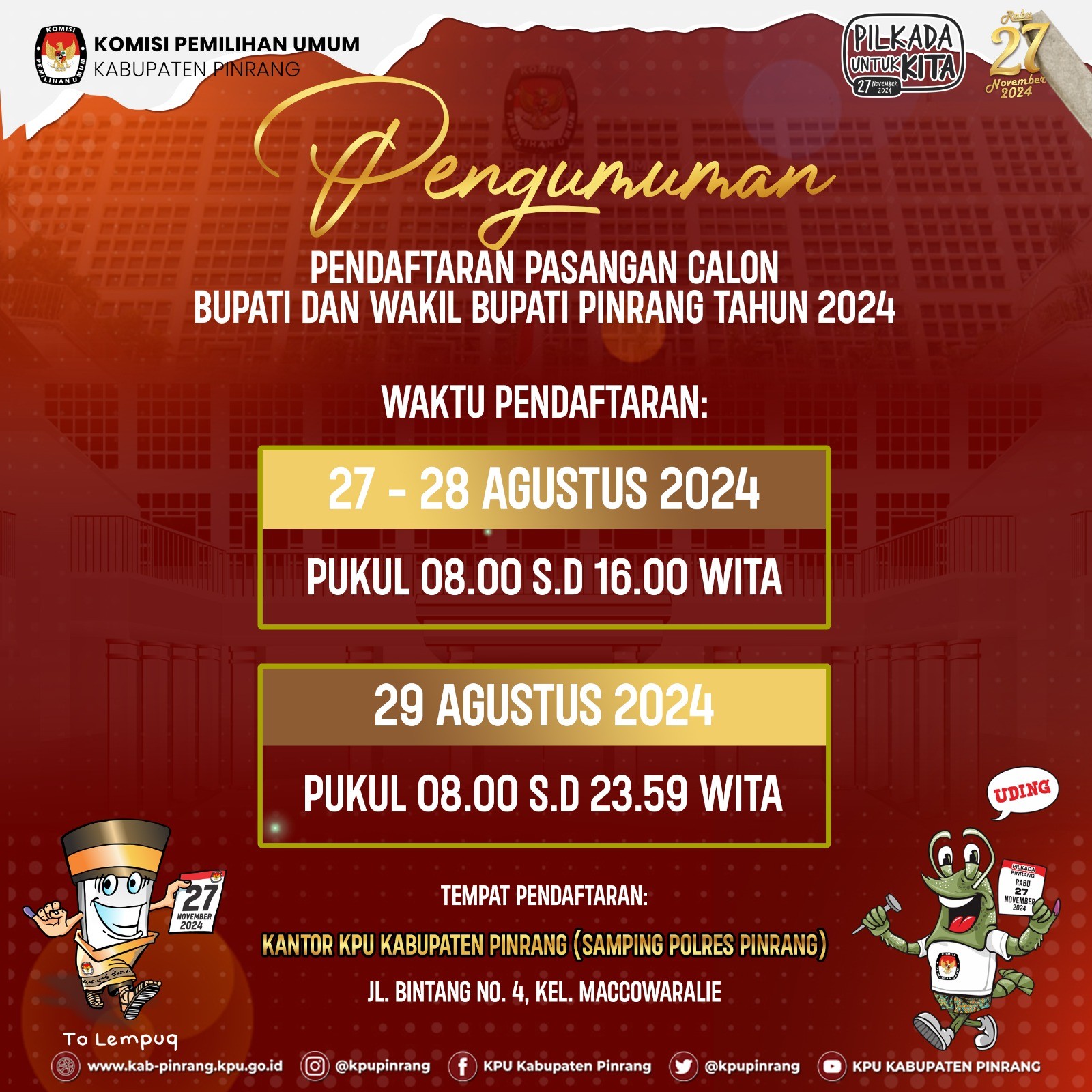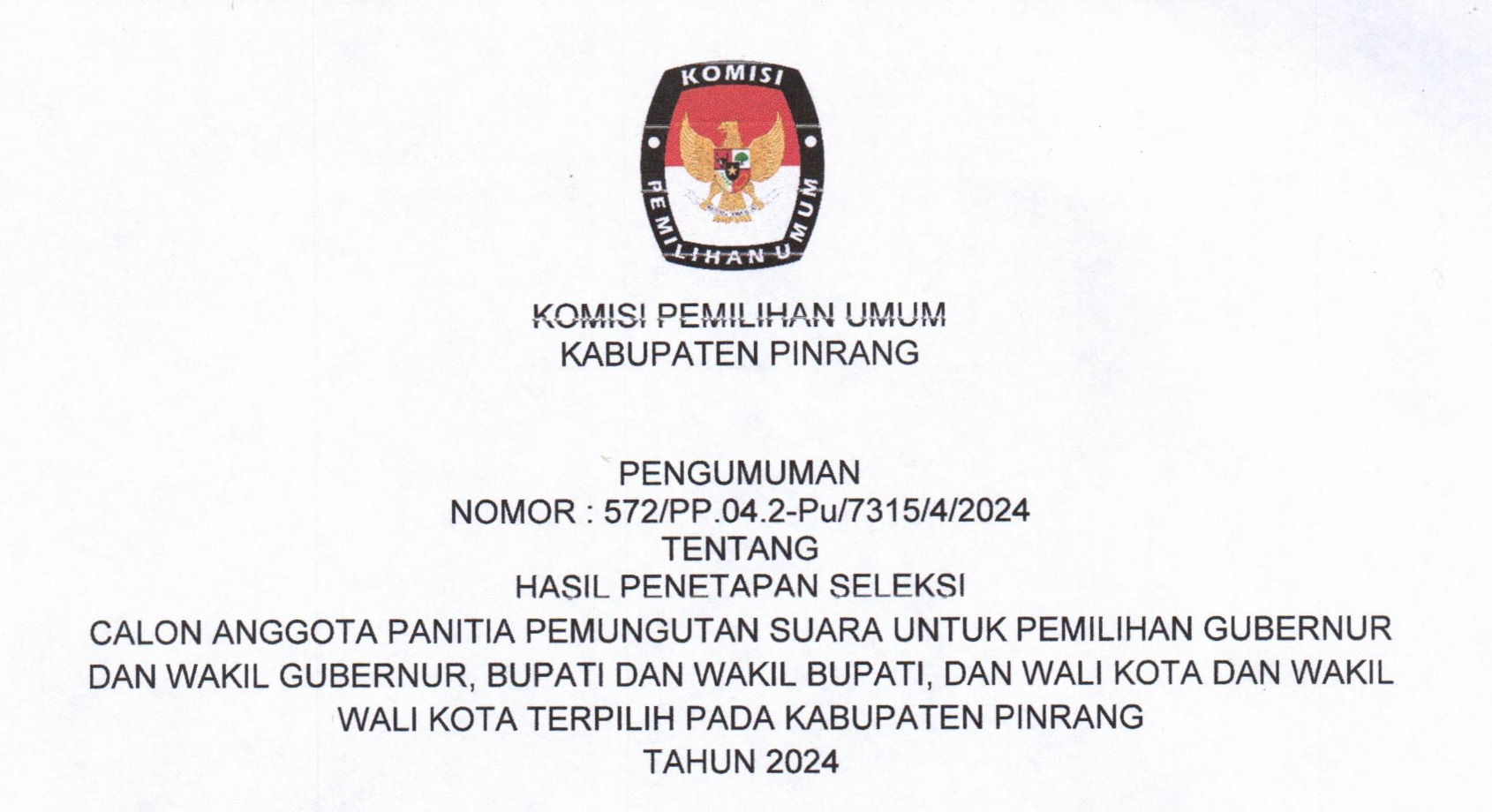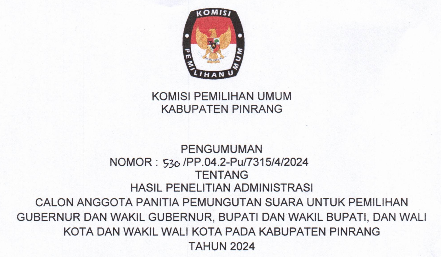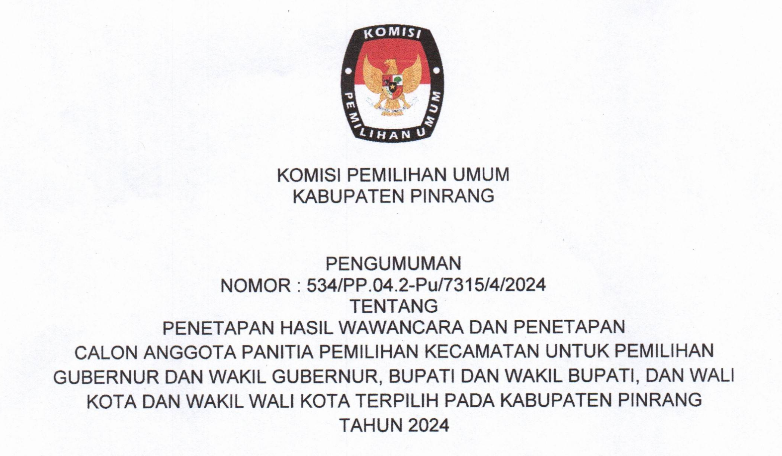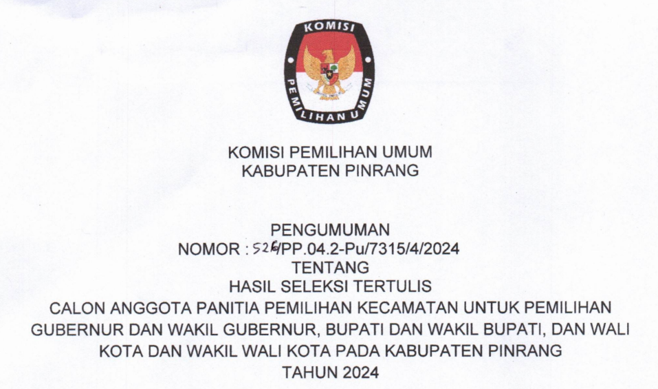 Pinrang, https://kab-pinrang.kpu.go.id/ - Sehubungan dengan Komisi Pemilihan Umum Kabupaten Pinrang telah melaksanakan Tahapan Wawancara dan menyelesaikan seluruh Tahapan Seleksi Calon Anggota Panitia Pemungutan Suara Untuk Pemilihan Gubernur dan Wakil Gubernur Sulawesi Selatan serta Pemilihan Bupati dan Wakil Bupati Pinrang Tahun 2024, disampaikan beberapa hal sebagai berikut:
