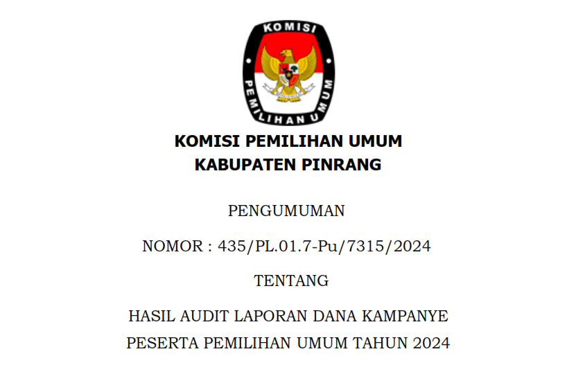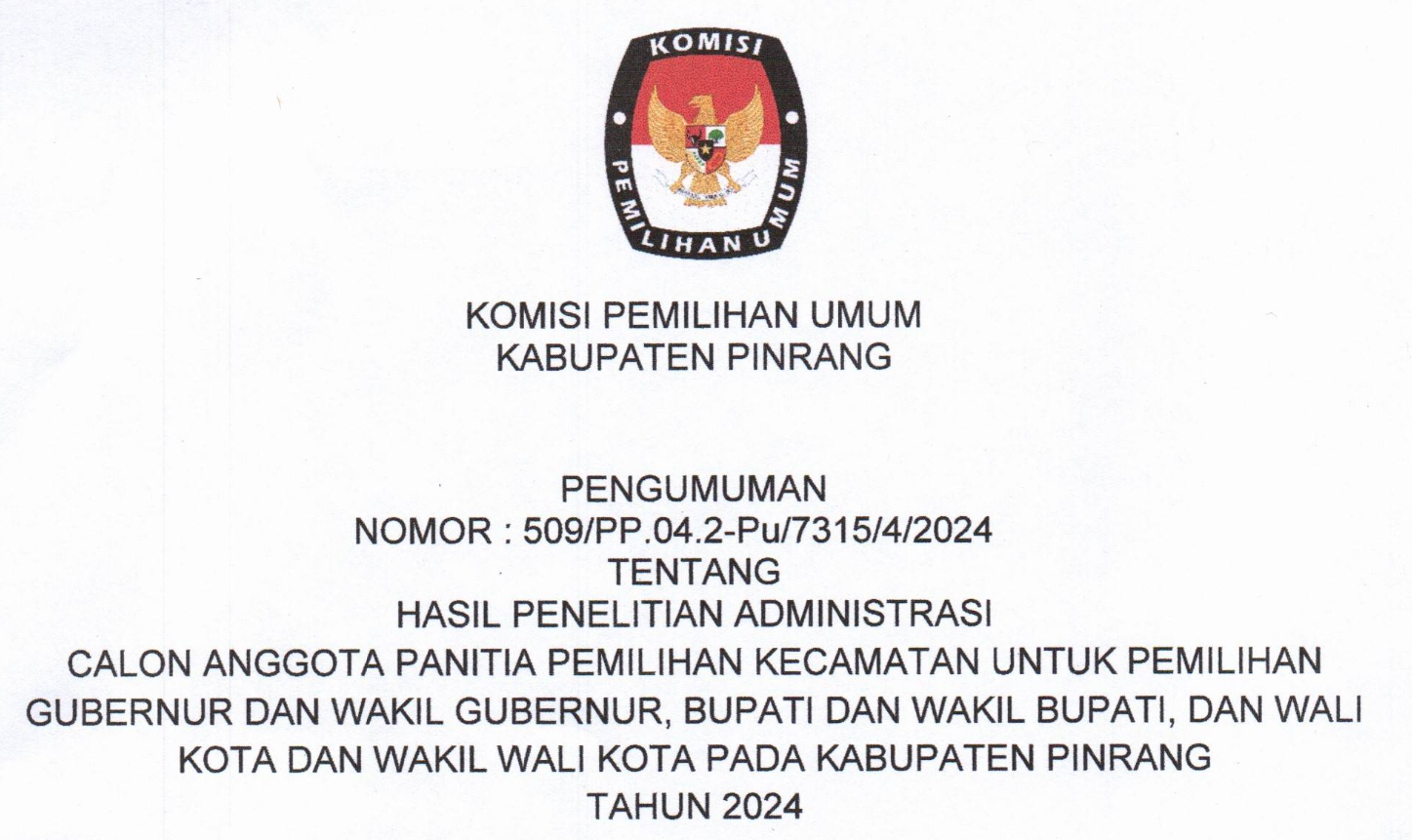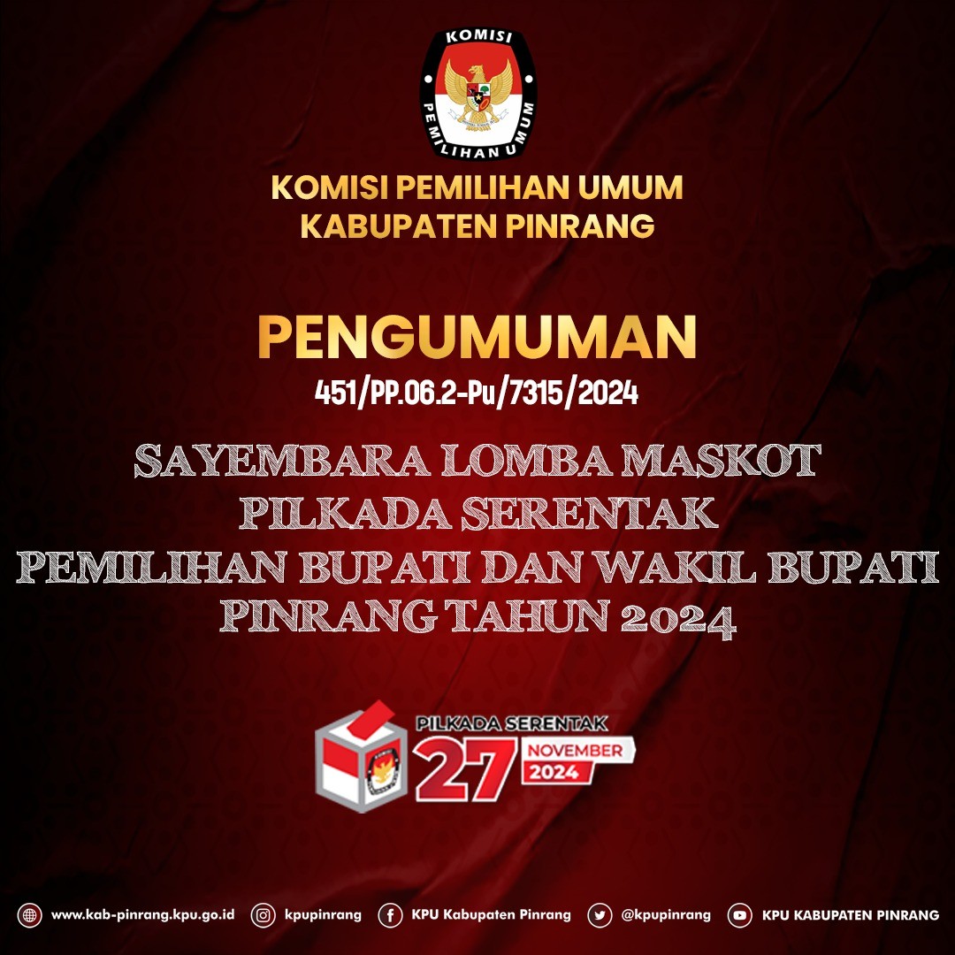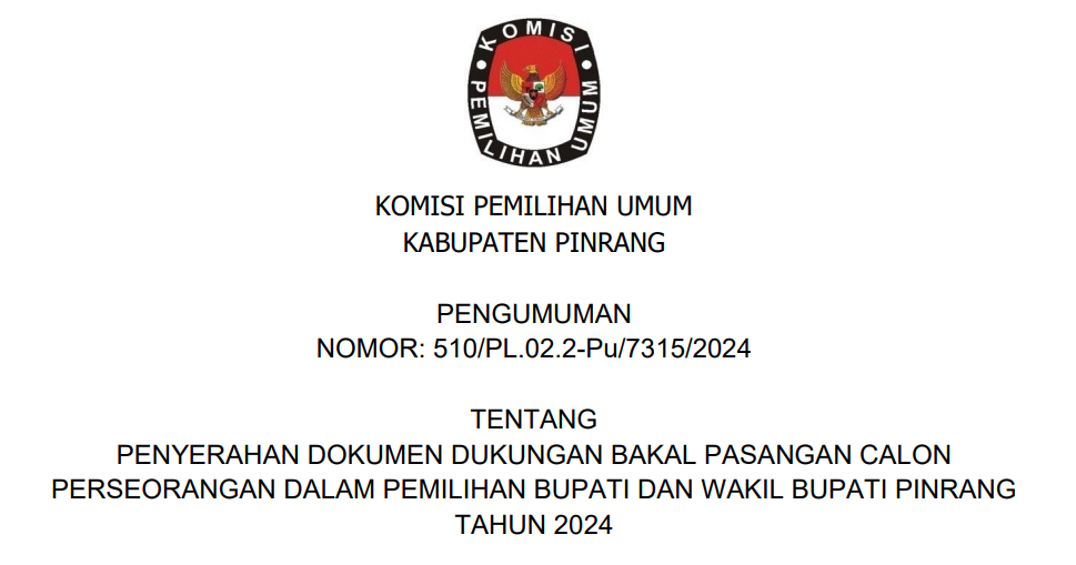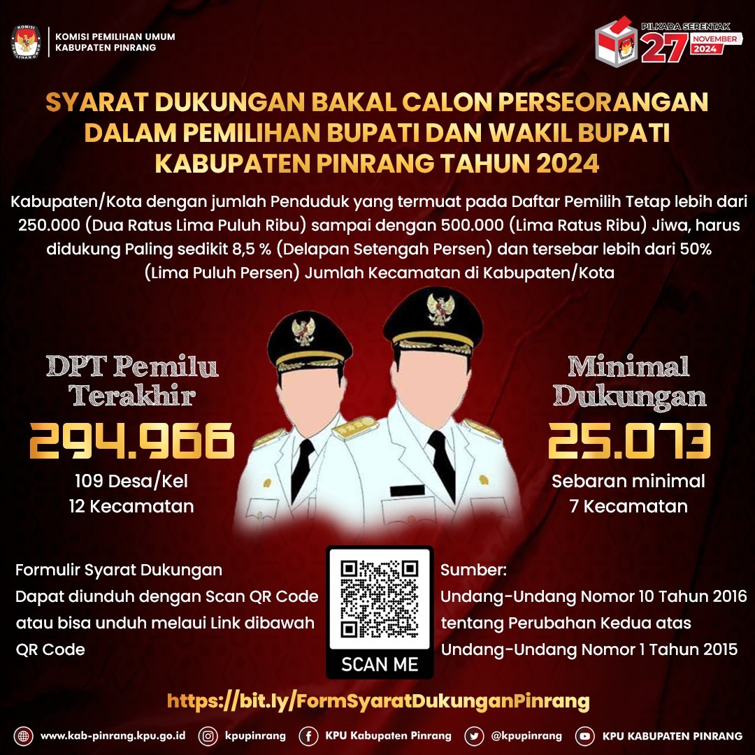 https://kab-pinrang.kpu.go.id/ - Berdasarkan Peraturan Komisi Pemilihan Umum Nomor 2 Tahun 2024 tentang Tahapan dan Jadwal Pemilihan Gubernur dan Wakil Gubernur, Bupati dan Wakil Bupati serta Walikota dan Wakil Walikota Tahun 2024 yang menyatakan bahwa Tahapan Pemenuhan Persyaratan Dukungan Pasangan Calon Perseorangan dimulai pada tanggal 5 Mei sampai dengan 19 Agustus 2024, maka Komisi Pemilihan Umum Kabupaten Pinrang menyampaikan hal-hal sebagai berikut: 1. KPU Kabupaten Pinrang akan menerima pengajuan dokumen dukungan Bakal Pasangan Calon Perseorangan Dalam Pemilihan Bupati dan Wakil Bupati Pinrang Tahun 2024 pada: Hari/Tanggal/Waktu : Rabu s.d Sabtu/ 8 s.d 11 Mei 2024 08.00 s.d 16.00 WITA, Minggu 12 Mei 2024 08.00 s.d 23.59 WITA Tempat : Kantor Komisi Pemilihan Umum Kabupaten Pinrang Jl. Bintang Kelurahan Maccorawalie, Kec. Watang Sawitto 2. Data Pemilih Tetap Terakhir Pemilu Tahun 2024 di Kabupaten Pinrang adalah 294.966 (dua ratus sembilan puluh empat ribu sembilan ratus enam puluh enam) Pemilih yang tersebar di 12 (dua belas) kecamatan di Kabupaten Pinrang. Sehingga Kabupaten Pinrang berada dalam angka lebih dari 250.000 (dua ratus lima puluh) sampai dengan 500.000 (lima ratus ribu) jiwa, maka syarat minimal dan persebaran dukungan bakal calon perseorangan dalam Pemilihan Bupati dan Wakil Bupati Pinrang Tahun 2024 paling sedikit 8,5% (delapan setengah persen) dari jumlah penduduk yang mempunyai hak pilih dan termuat dalam Daftar Pemilih Tetap Pemilu Tahun 2024 yang tersebar di 12 (dua belas) kecamatan di Kabupaten Pinrang yakni sebanyak 25.073 (dua puluh lima ribu tujuh puluh tiga) dukungan dan sebaran minimal sebanyak 7 (tujuh) kecamatan di Kabupaten Pinrang. Ketentuan, syarat dan tata cara pendaftaran dapat diunduh pada pengumuman di bawah ini. Info Selengkapnya dapat menghubungi Sdr. A. M. Yasien (0821-8760-7513) dan Muh. Aedil (0812-4221-3717). 1. PENGUMUMAN 2. DOKUMEN PERSYARATAN