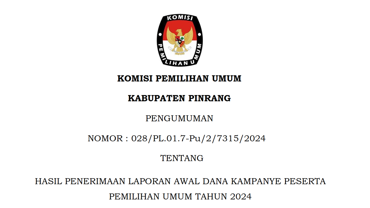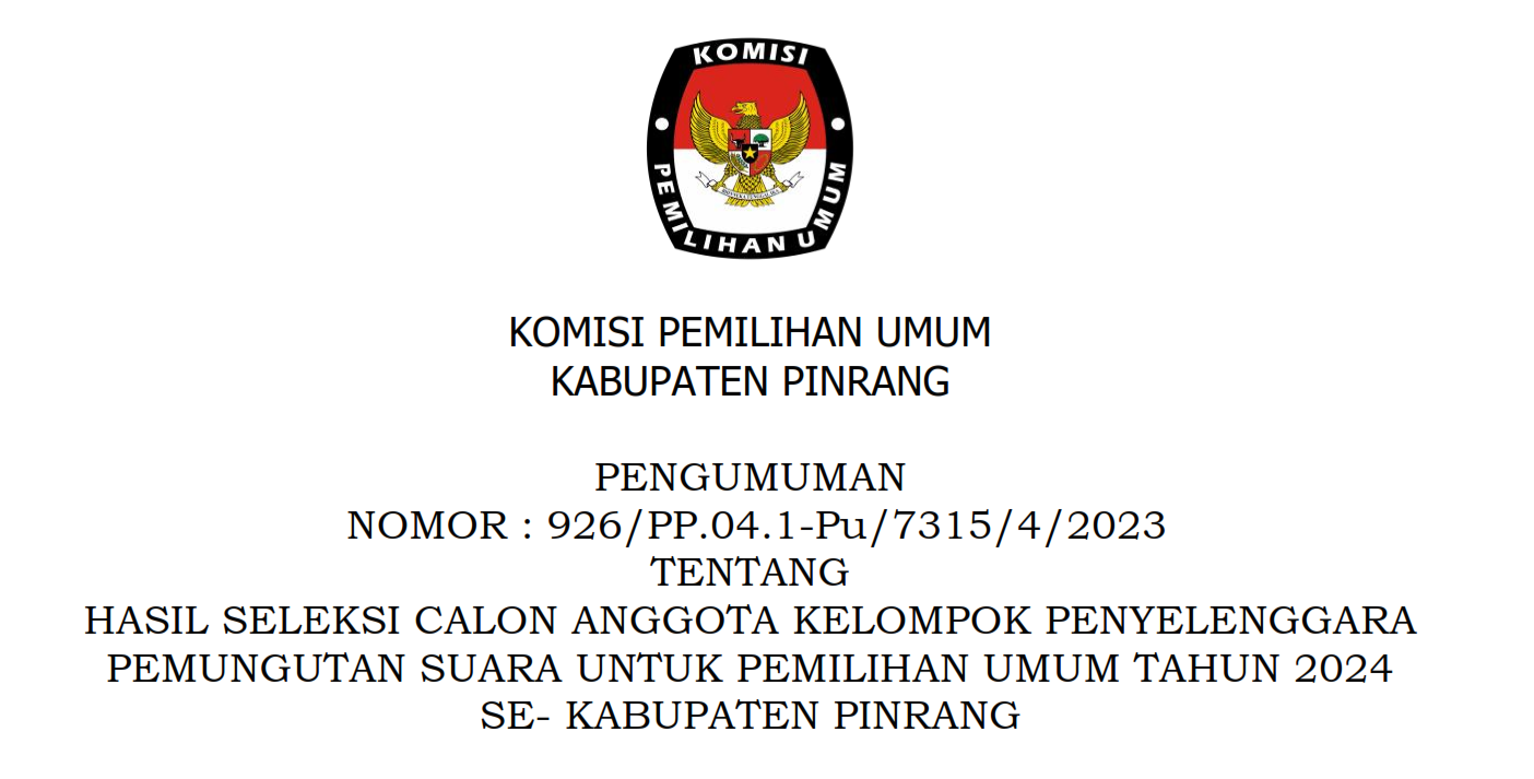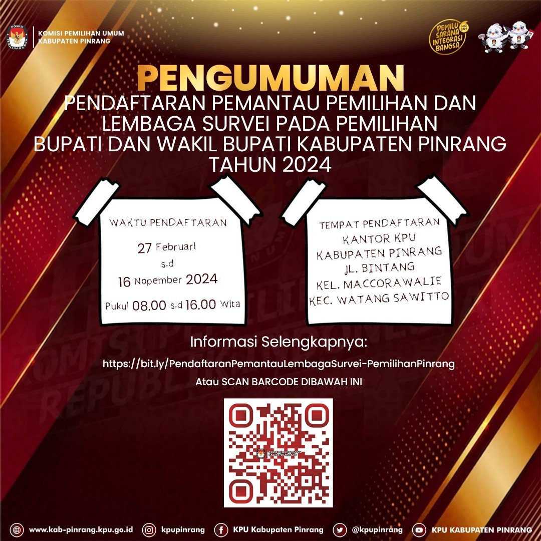 Pinrang, https://kab-pinrang.kpu.go.id/ - Berdasarkan Peraturan Komisi Pemilihan Umum Nomor 9 Tahun 2022 tentang Partisipasi Masyarakat dalam Pemilihan Umum dan Pemilihan Gubernur dan Wakil Gubernur, Bupati dan Wakil Bupati, dan/atau Walikota dan Wakil Walikota serta Keputusan Komisi Pemilihan Umum Nomor 328 Tahun 2024 tentang Pedoman Teknis Pendaftaran Pemantau dan Lembaga Survei atau Jajak Pendapat dan Penghitungan Cepat Hasil Pemilihan Gubernur dan Wakil Gubernur, Bupati dan Wakil Bupati, serta Wali Kota dan Wakil Wali Kota, maka KPU Kabupaten Pinrang membuka Pendaftaran Pemantau Pemilihan dan Lembaga Survei pada Pemilihan Bupati dan Wakil Bupati Pinrang Tahun 2024 sebagai berikut: