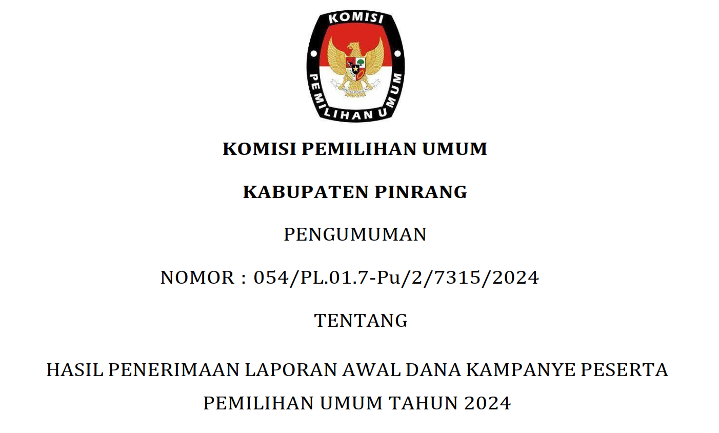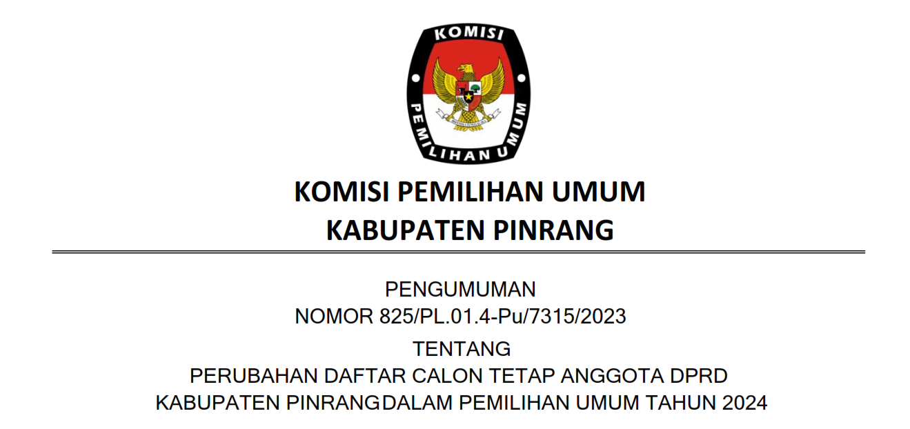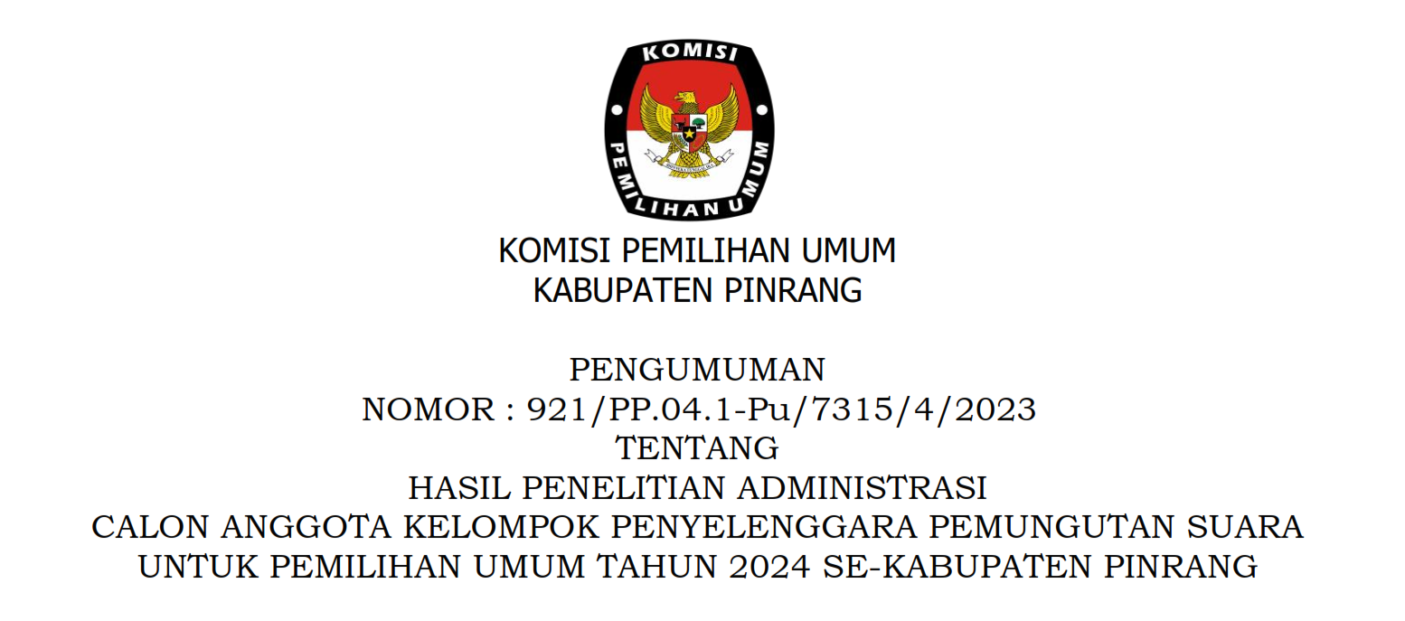 Pinrang, https://kab-pinrang.kpu.go.id/ - Berdasarkan Peraturan Komisi Pemilihan Umum Nomor 9 Tahun 2022 tentang Partisipasi Masyarakat dalam Pemilihan Umum dan Pemilihan Gubernur dan Wakil Gubernur, Bupati dan Wakil Bupati, dan/atau Walikota dan Wakil Walikota serta Keputusan Komisi Pemilihan Umum Nomor 328 Tahun 2024 tentang Pedoman Teknis Pendaftaran Pemantau dan Lembaga Survei atau Jajak Pendapat dan Penghitungan Cepat Hasil Pemilihan Gubernur dan Wakil Gubernur, Bupati dan Wakil Bupati, serta Wali Kota dan Wakil Wali Kota, maka KPU Kabupaten Pinrang membuka Pendaftaran Pemantau Pemilihan dan Lembaga Survei pada Pemilihan Bupati dan Wakil Bupati Pinrang Tahun 2024 sebagai berikut: